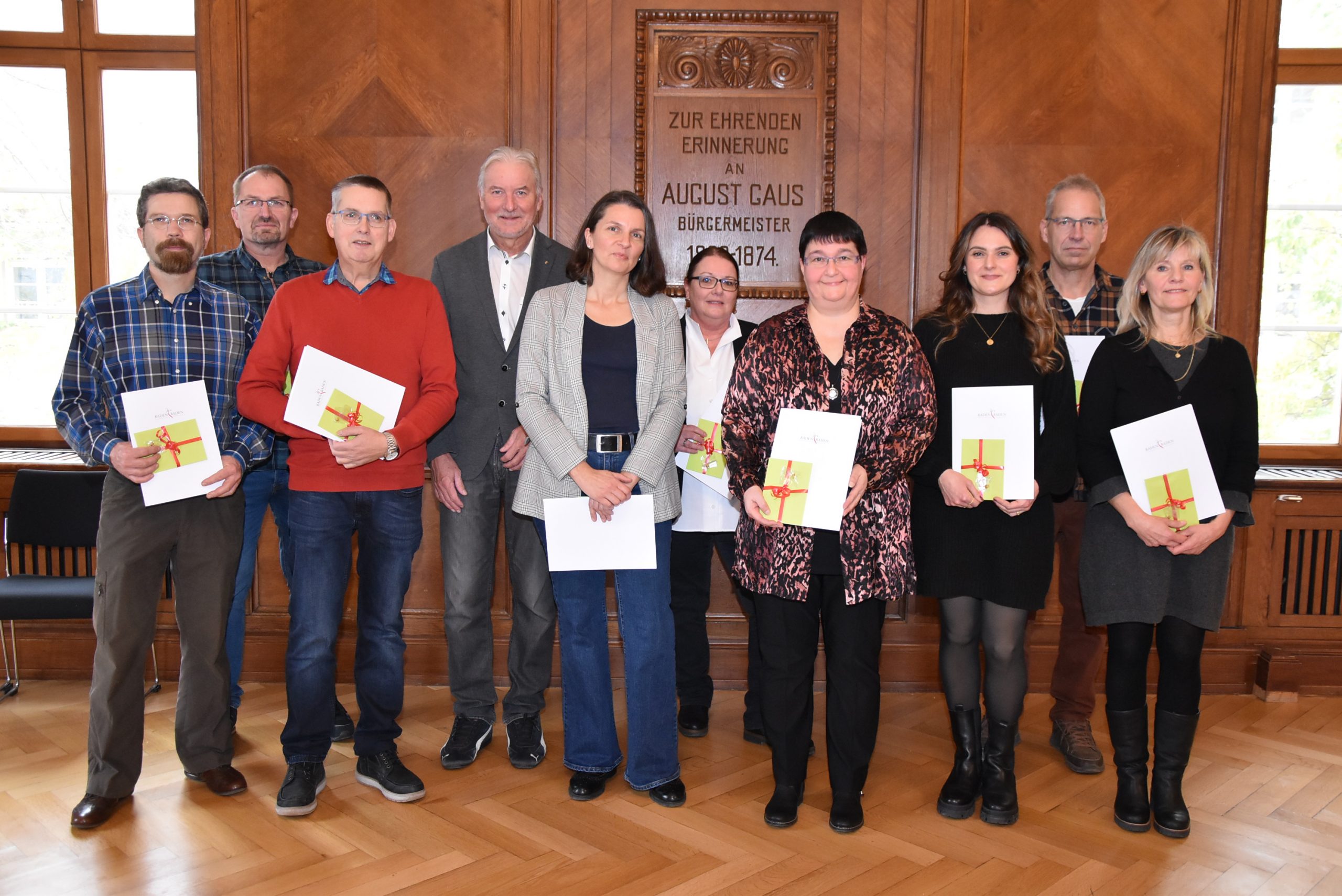 Die 25- und 40-jährigen Dienstjubilare mit OB Dietmar Späth (4. von links): Frank Wieland, Frank Möst, Bernd Sieber, Carolin Reif, Monika Probst, Sabine Huber, Simone König, Martin Braun und Pia Ziegler (von links nach rechts). Foto: Sibylle Hurst / Stadt Baden-Baden